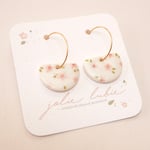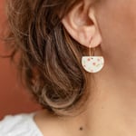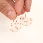 Délicates et poétiques, ces boucles d’oreilles s’inspirent de la douceur des fleurs de cerisier. Leurs petites fleurs rosées, subtilement parsemées sur un fond blanc lumineux, apportera une touche romantique et printanière.