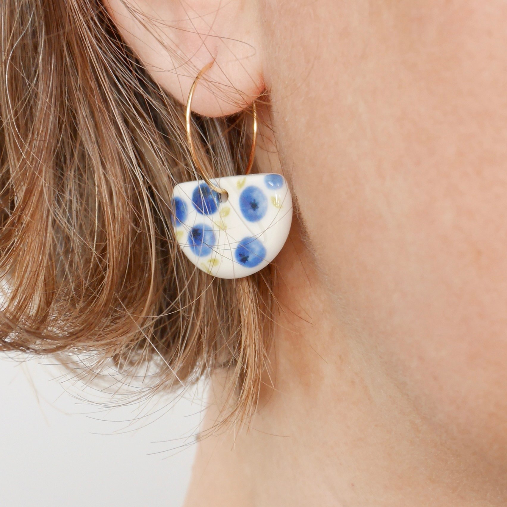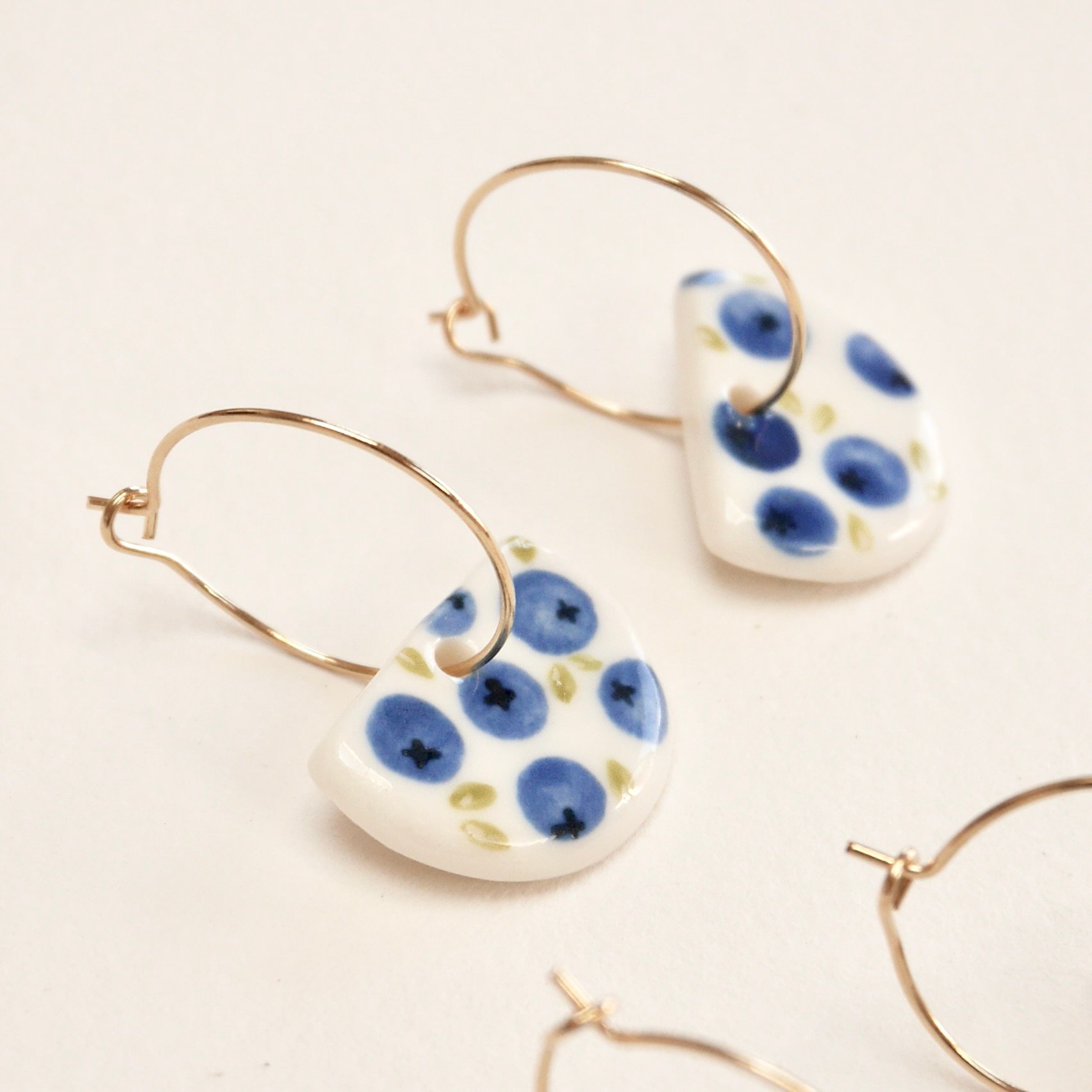 Succombez au charme délicat de ces boucles d’oreilles en porcelaine émaillée, ornées d’un motif de myrtilles aux teintes bleues profondes. À la fois douces et pétillantes, elles apportent une note fruitée et élégante à votre style.